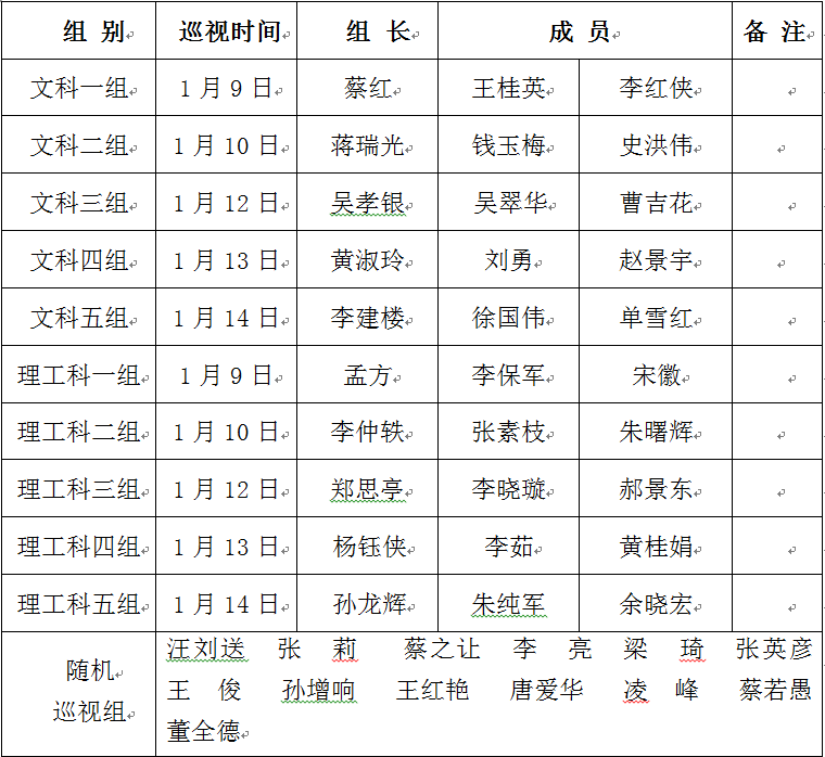 1.期末考试巡视组由全体学院领导、有关职能部门负责人、学院教学督导委员会委员和各二级学院教学督导组成,巡视分组及成员名单如下表: