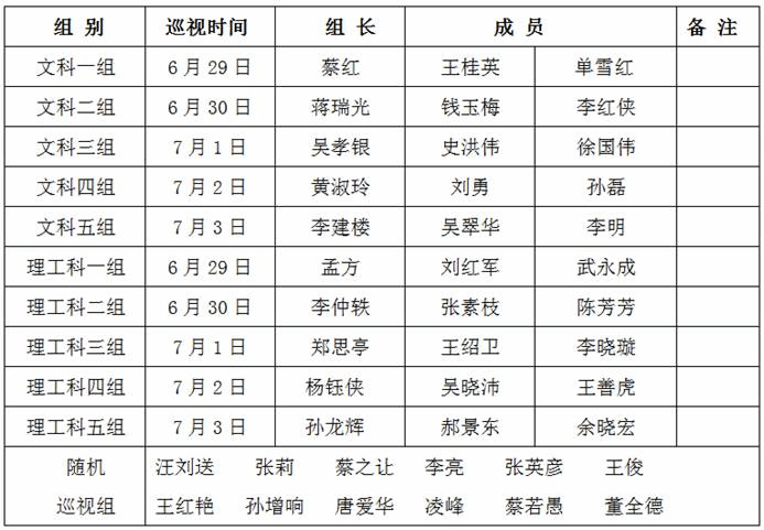1.学校期末考试巡视组由全体校领导、有关职能部门负责人、校教学督导委员会委员和各二级学院选派人员组成,巡视分组及成员名单如下表: